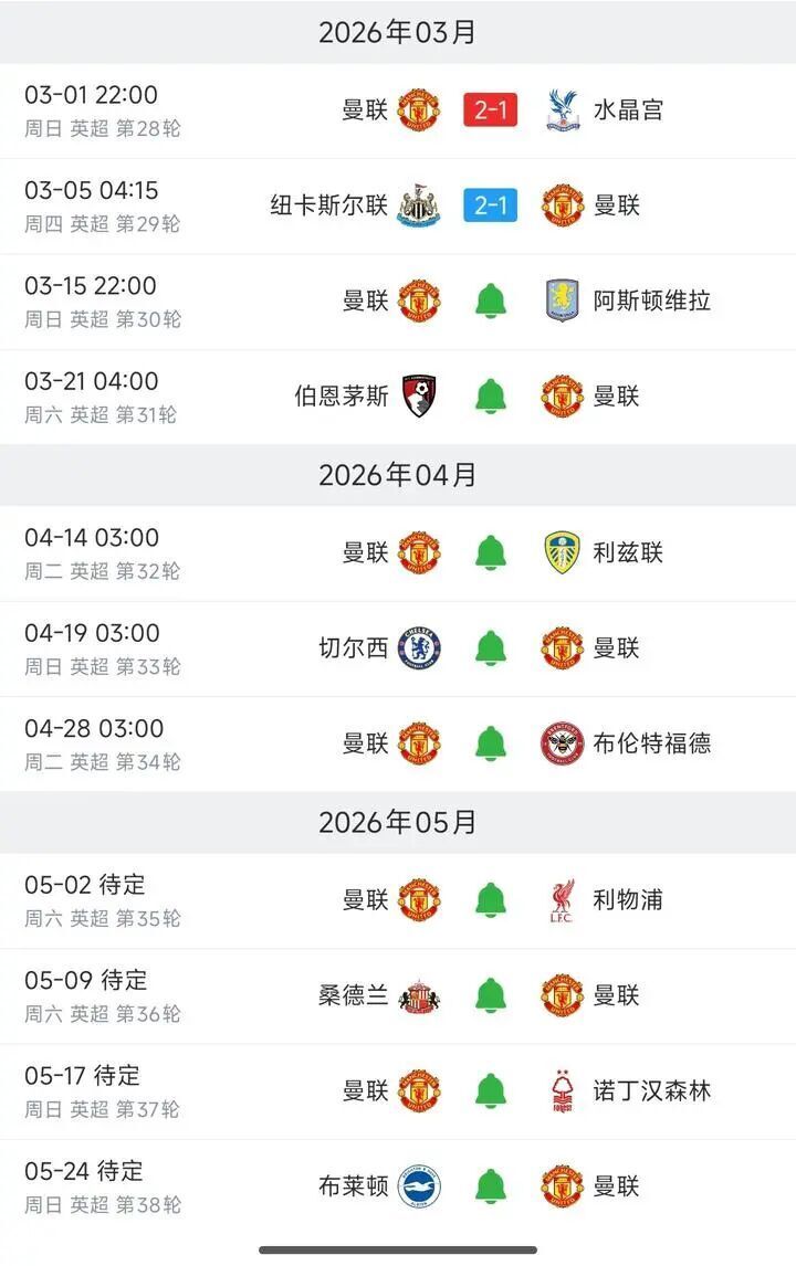 首先是曼联。这四家里面,曼联的赛程是最轻松的,因为他们现在就剩下9场英超了,而利物浦和切尔西都有欧冠要打,维拉还有欧联。所以曼联的赛程优势,是很现实的。
