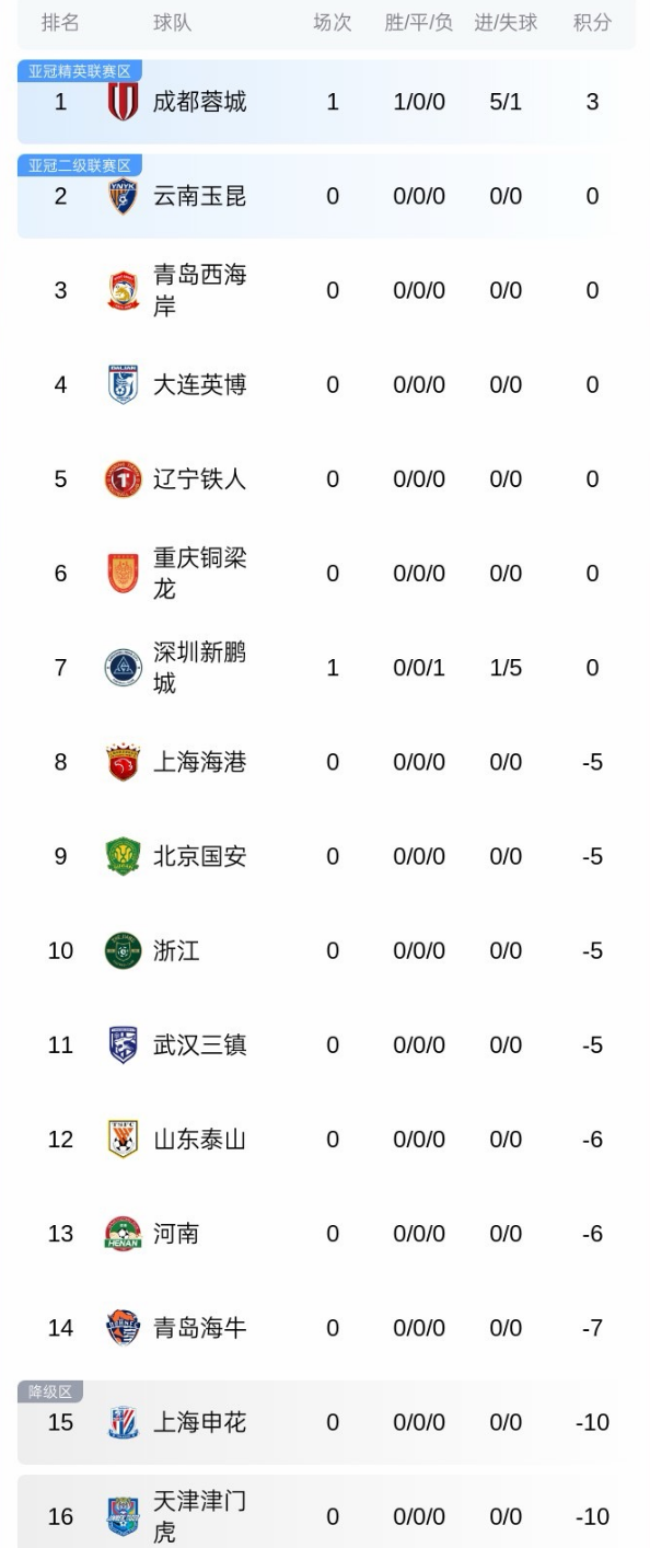 北京时间3月6日晚,新赛季的中超联赛开赛了,成都蓉城在主场出战揭幕战,对手是深圳新鹏城。两队在上赛季中超收官战中交手,当时战成1-1平,蓉城此前4次跟新鹏城碰面,取得3胜1平的战绩。在本场比赛中,蓉城逆转取得大捷。随着蓉城5-1大胜新鹏城,中超最新积分榜出炉!申花落后榜首13分。