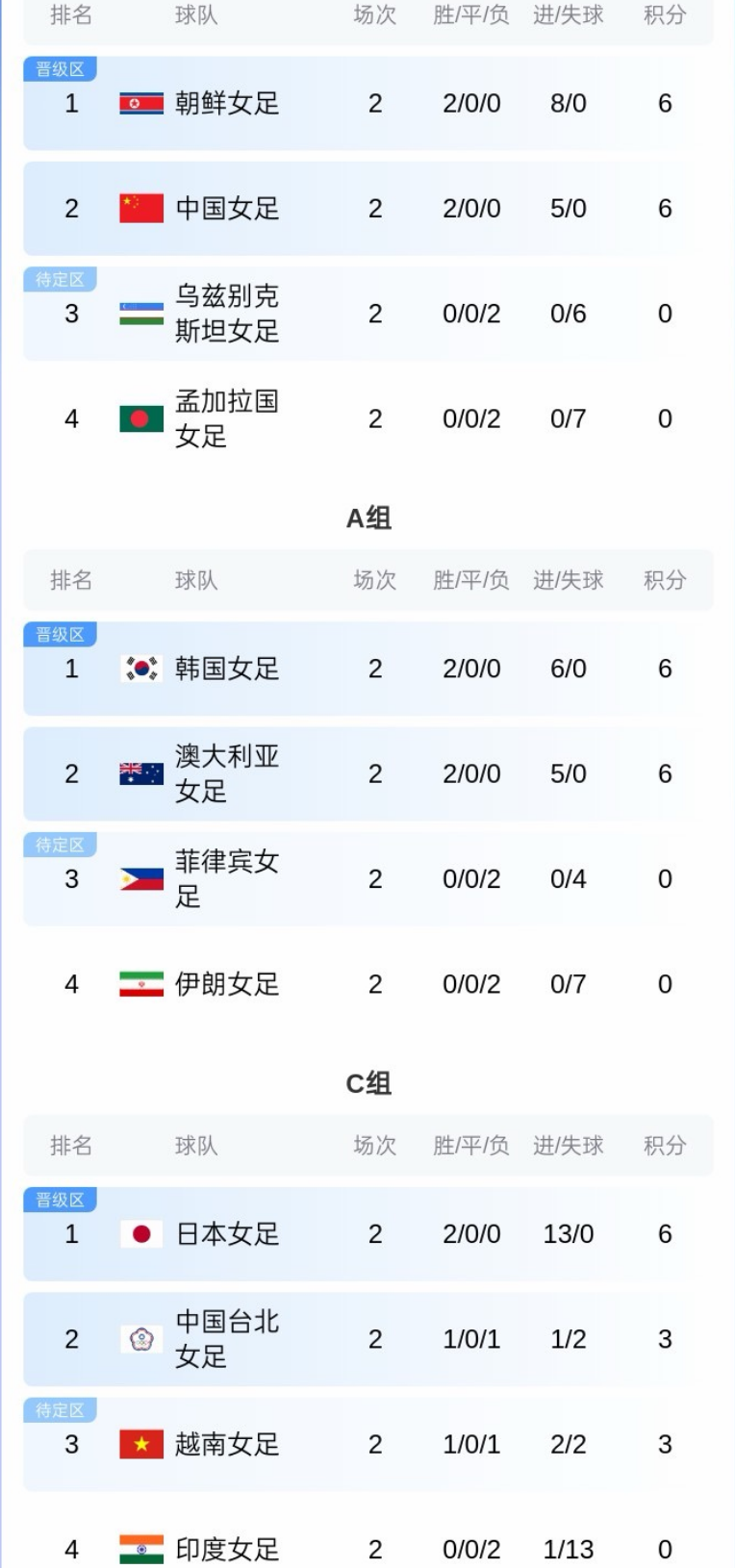 在亚洲杯C组积分榜上,日本6分出线,中国台北队以及越南队均为3分,排名第2、3位,印度0分垫底。在B组中,朝鲜以及中国女足6分出线,乌兹别克斯坦、孟加拉国0分,排名第3、4位。A组中,2连胜的韩国以及澳大利亚晋级8强,菲律宾、伊朗0分,排在第3、4位。