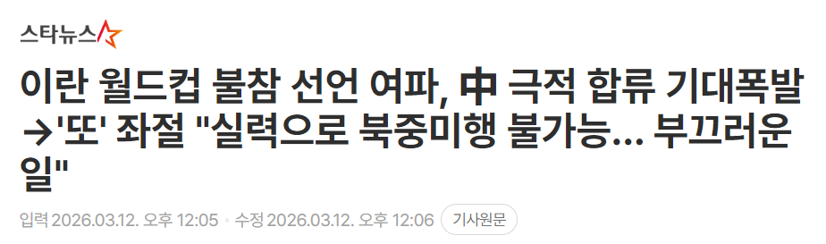 “中国球迷曾极其期待的‘戏剧性递补’根本不现实。”韩联社12日进一步指出:“伴随着伊朗队大概率无缘2026年美加墨世界杯,但空缺名额预计不会由中国男足填补。曾觊觎伊朗空位的中国男足,其递补参赛的期待事实上已宣告落空。”