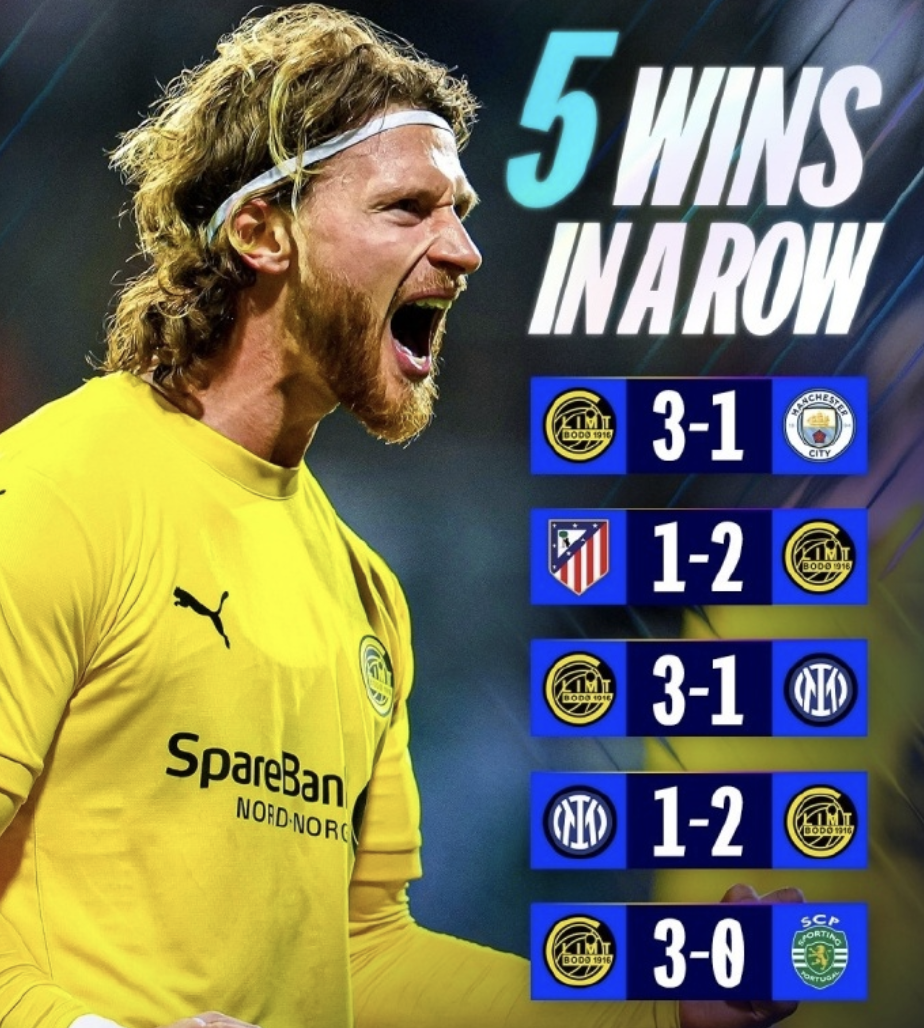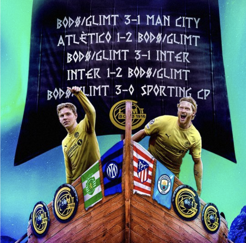 博德闪耀俱乐部位于挪威的小城博德,城市人口只有5.4万人。本赛季,他们首次征战欧冠赛场。欧冠的联赛阶段,他们前6场一场没赢,几乎铁定无缘淘汰赛。没想到,他们在最后2轮连赢曼城和马竞。