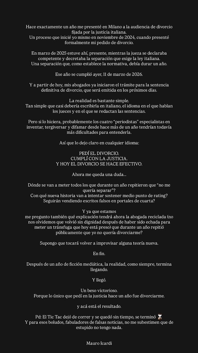 雷速体育3月13日讯 伊尔卡迪通过个人社媒发表声明,经历了一年的诉讼程序后,他与旺达的离婚判决正式生效。