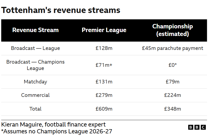 根据英国广播公司的分析,如果从英超降级,热刺可能会在一个赛季内损失大约2.61亿英镑的收入。这个数字来自多个方面,包括比赛日收入、电视转播收入、商业赞助以及各种奖金等。