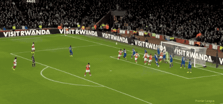 第44分钟,赖斯开出角球,萨卡停球过大,之后的射门被封堵,马杜埃凯的射门也被挡出,埃泽的射门放了高射炮,枪手球员的焦急体现的淋漓尽致。