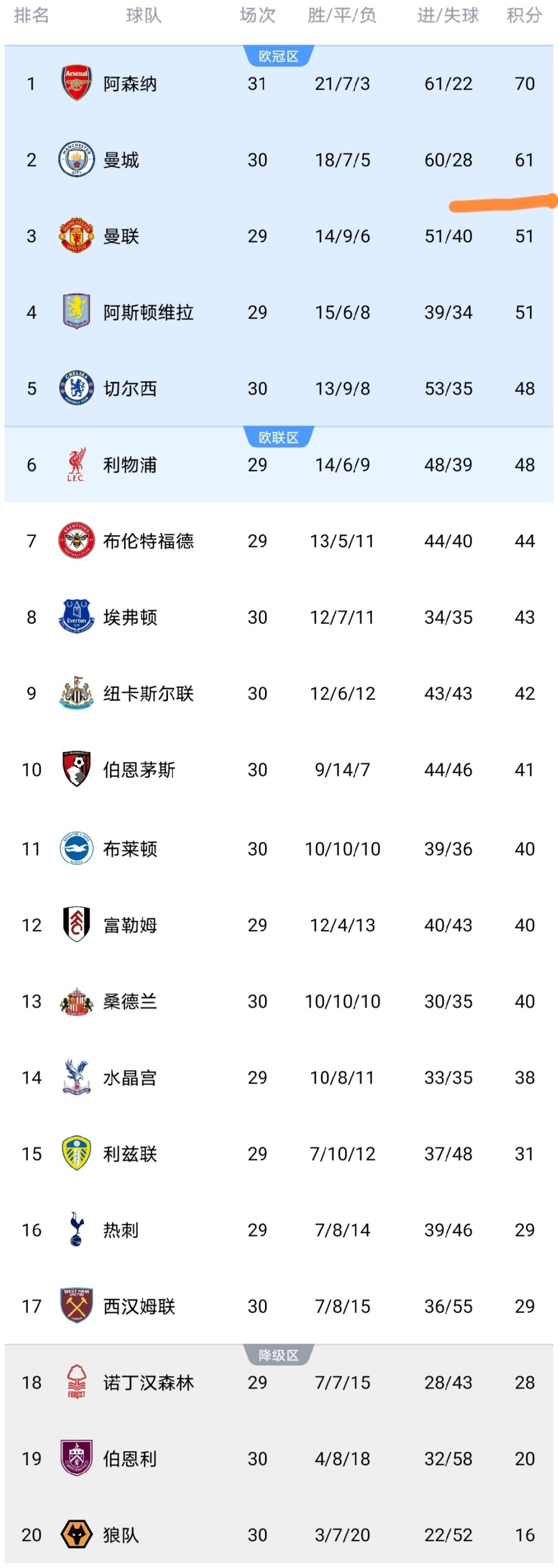 这几场比赛之后,英超最新积分榜随之更新。阿森纳以70分领跑,曼城积61分紧随其后,切尔西仍以48分排名第五,布莱顿凭借胜利升至第11位,伯恩利则以20分深陷降级区。后续赛程中,豪门球队的表现将直接决定争冠与欧战资格的归属,保级区球队的较量也将愈发激烈。