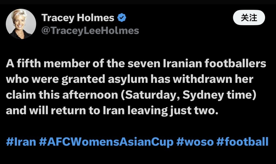 北京时间3月15日,据澳大利亚知名记者特蕾西-霍尔姆斯报道,继昨晚2名伊朗女足球员反悔之后,又有1人撤回庇护申请,要求返回伊朗。