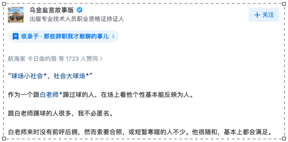 据该网友描述,白岩松私下踢球时为人随和,到场没有前呼后拥,对于合影或寒暄的要求基本都会满足。