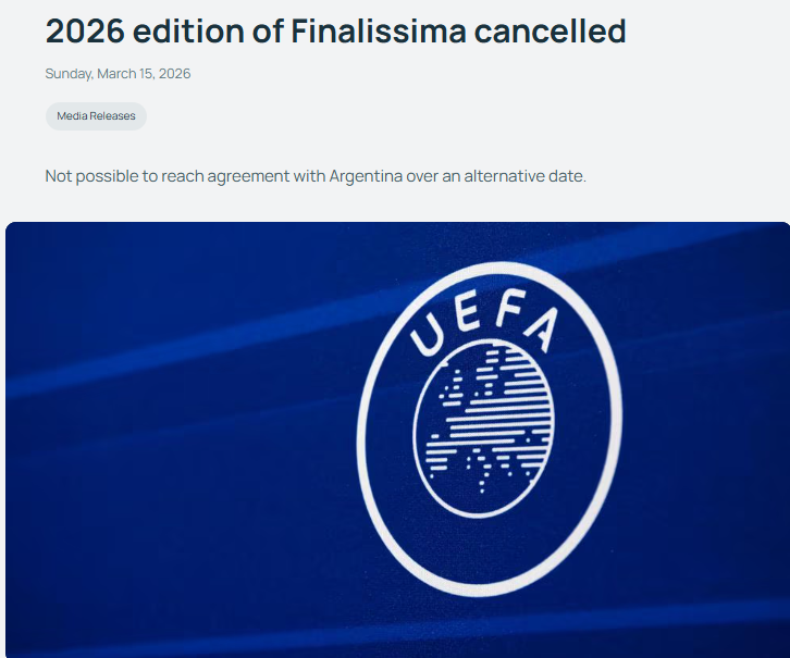 根据欧足联官方消息,原定于2026年举行的欧美杯(Finalissima)已经被正式取消。