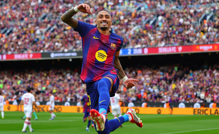 西甲:拉菲尼亚帽子戏法巴萨5-2大胜 坎塞洛破门+造2点球