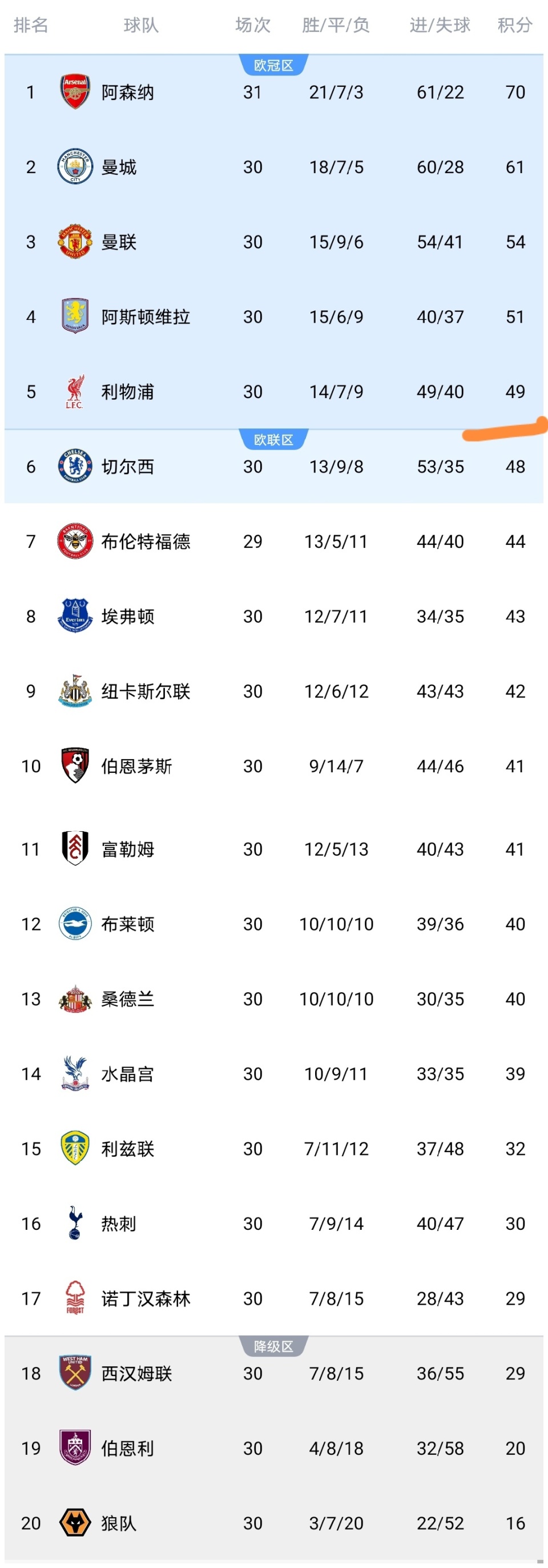 这四场比赛之后,英超最新积分榜更新:阿森纳70分领跑,曼城61分紧随其后;曼联积54分坐稳第三,利物浦积49分升至第5,落后维拉2分;利兹联、富勒姆分别积32分、41分稳居中游,诺丁汉森林暂离降级区。联赛进入冲刺阶段,每一场胜利都将影响最终格局,后续较量值得球迷持续关注。