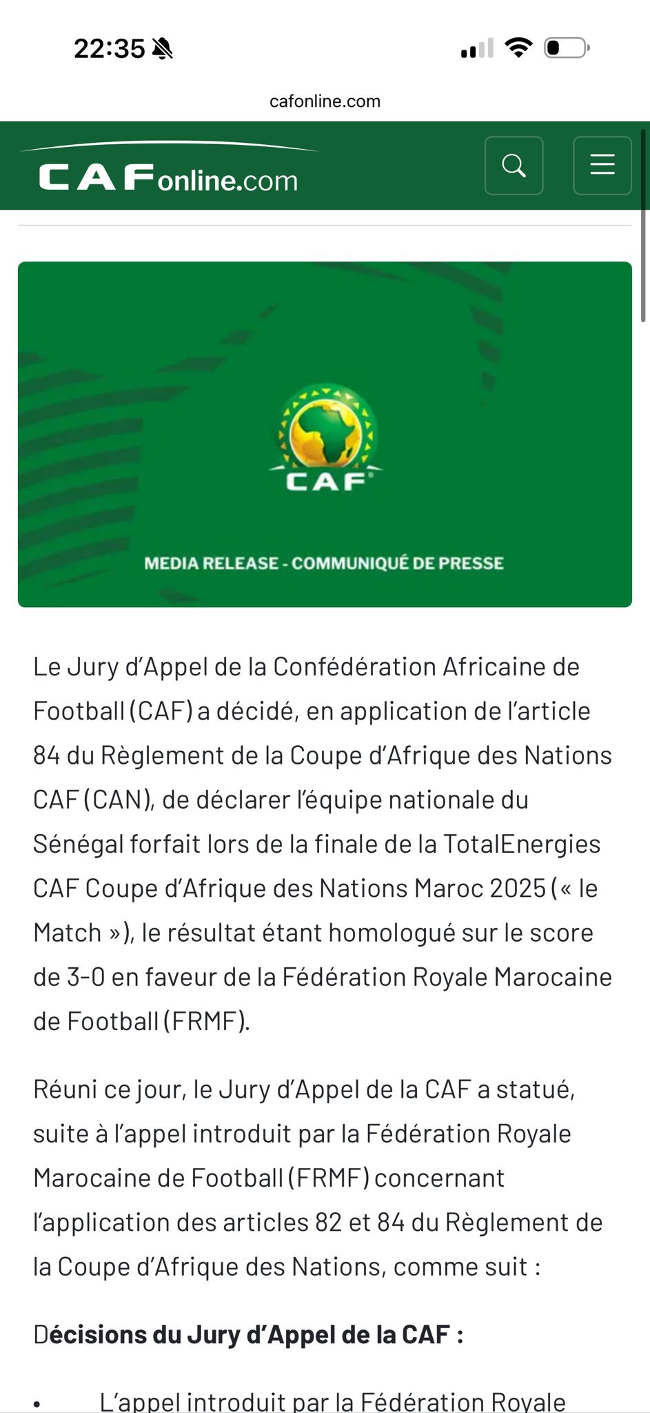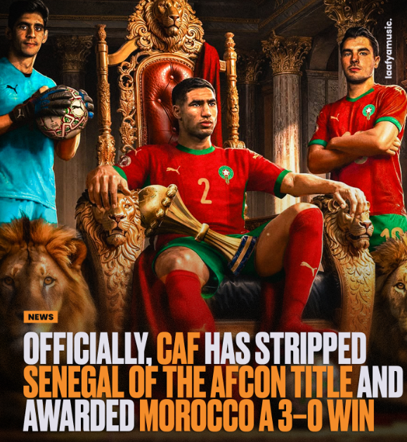 非洲足球联合会(CAF)做出一项轰动性的决定,剥夺塞内加尔赢得的冠军头衔,并将其授予摩洛哥。