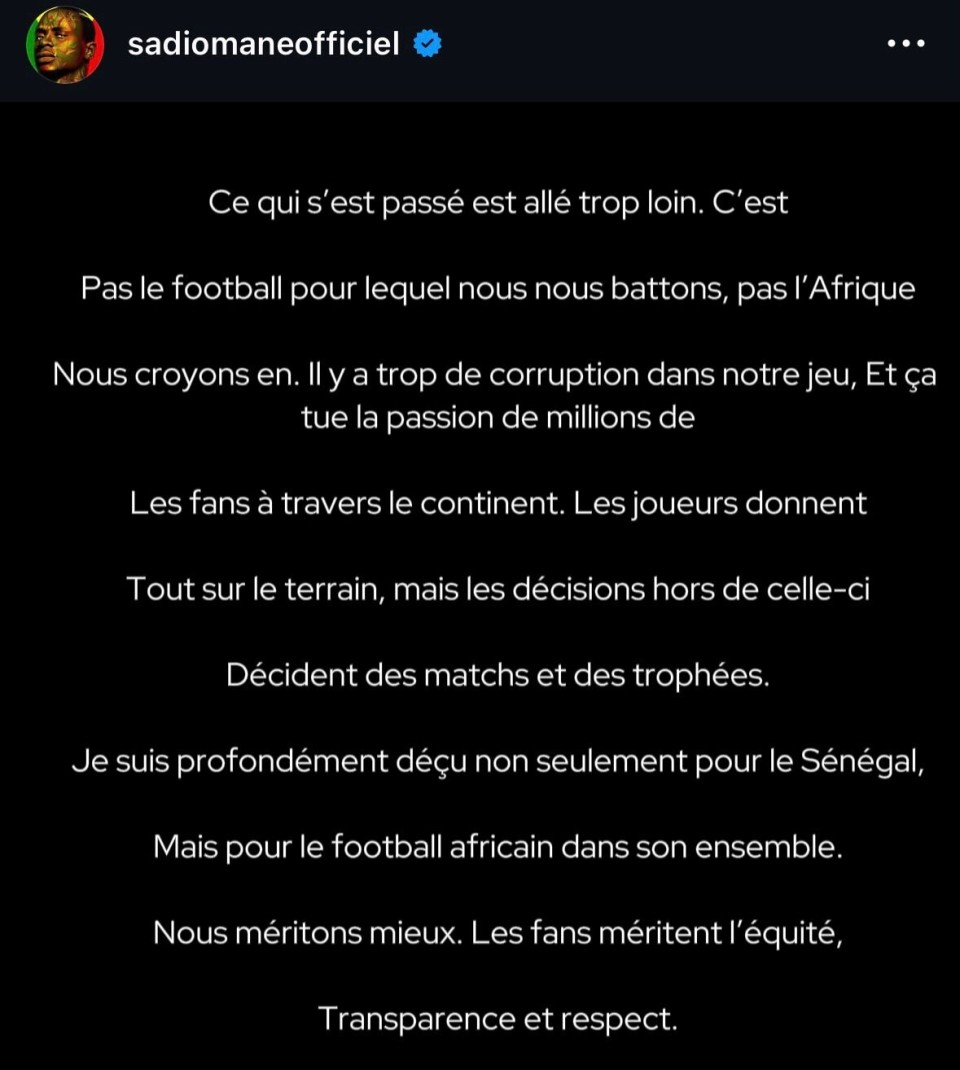 “球员们在场上拼尽全力,但场外的决定却左右着比赛和奖杯的归属,我深感失望,不仅为塞内加尔,也为整个非洲足球。我们理应得到更好的待遇。球迷理应得到公平、透明和尊重。”