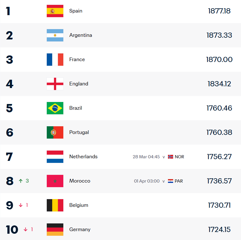 从官方数据来看,这次排名也出现了一些值得关注的波动。摩洛哥上升三位,跻身世界第八;而比利时和德国则各自下滑一位。