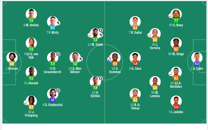 利物浦首发:1-阿利松、4-范戴克、5-科纳特、30-弗林蓬(67’17-柯蒂斯·琼斯)、6-凯尔凯兹、38-赫拉芬贝赫(89’42-尼奥尼)、8-索博斯洛伊、10-麦卡利斯特、11-萨拉赫(74’18-加克波)、7-维尔茨(89’73-恩古莫哈)、22-埃基蒂克(89’14-基耶萨)