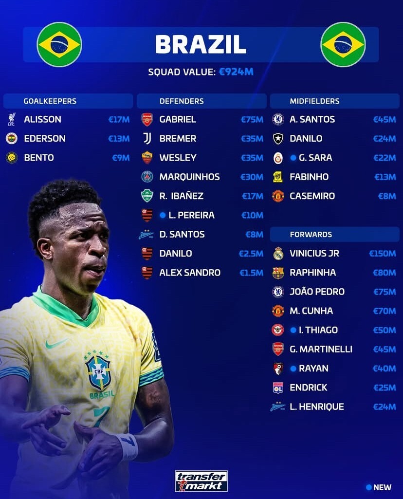 新一期巴西队身价榜:维尼修斯1.5亿欧第1,拉菲尼亚8000万第2