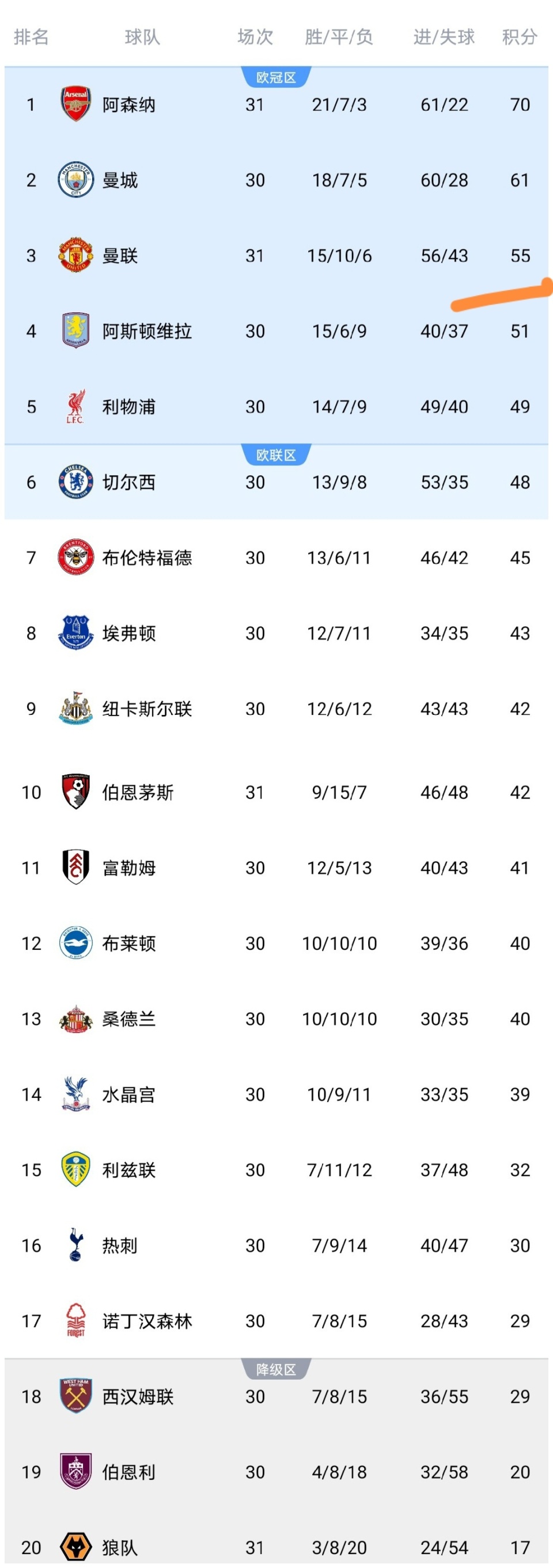 可以看到曼联在客场遭逼平之后,积分仅上涨到了55分,继续排名第3,错失了缩小跟曼城分差的良机,非常可惜啊,此外曼联多赛一场领先第6的切尔西队7分,如果切尔西、维拉、利物浦本轮取胜,那么曼联领先优势会缩小,欧冠席位不一定就稳了。所以曼联还是要减少不必要的丢分,加油吧!而伯恩茅斯拿到1分之后,积分上涨到了42分,排名第10。