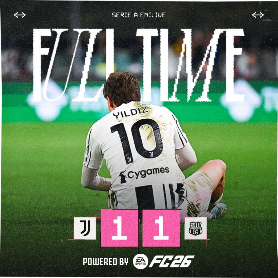 尤文图斯主场1-1战平萨索洛,无缘三连胜,积54分仍排在积分榜第五位。孔塞桑助攻伊尔迪兹破门,皮纳蒙蒂接贝拉尔迪助攻扳平比分,伊泽斯手球送点,洛卡特利点球被扑。