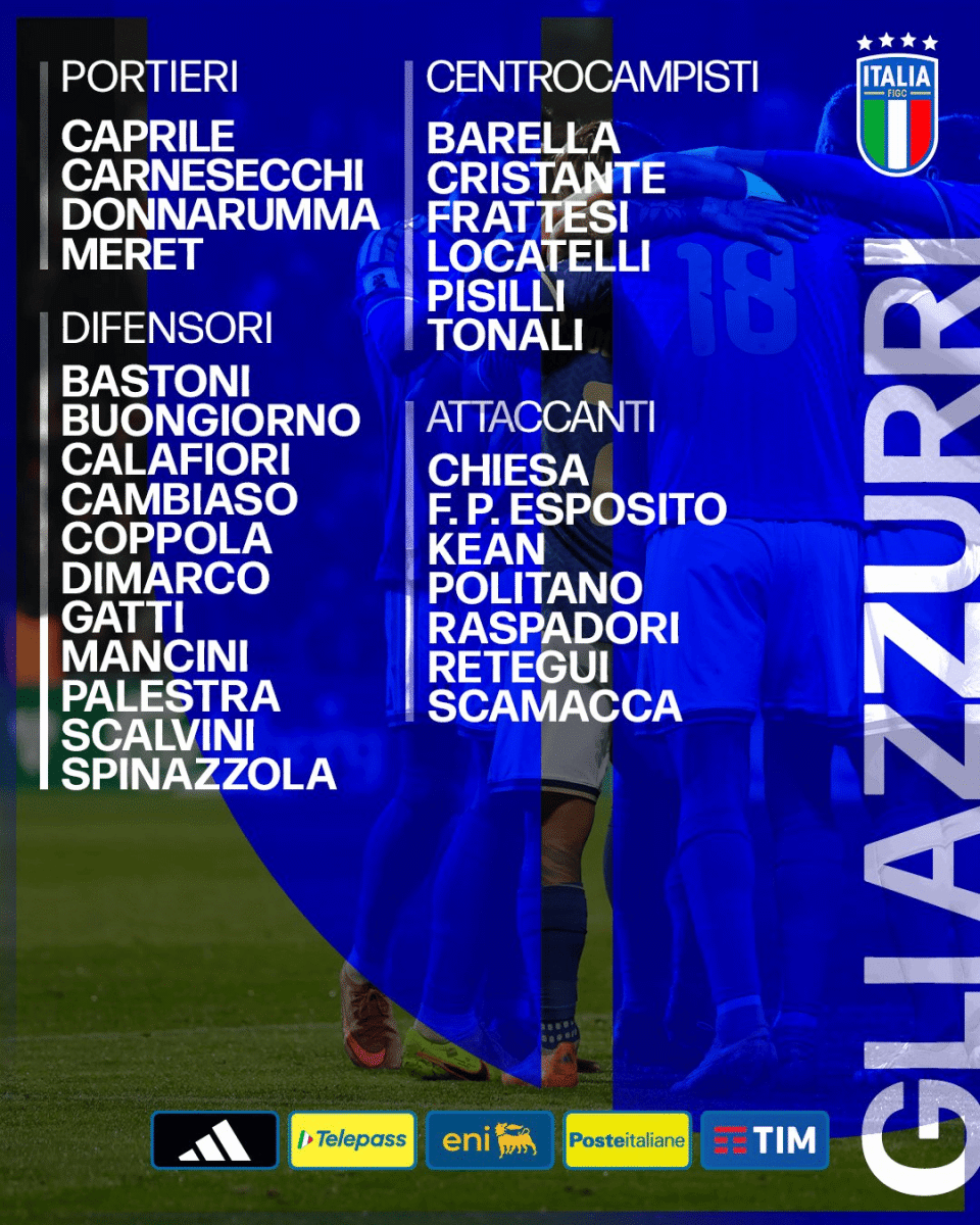 虎扑03月20日讯 意大利国家队公布了三月份世界杯预选赛附加赛的28人大名单,基耶萨回归,托纳利、巴斯托尼等人在列。