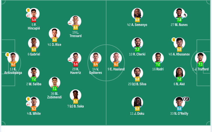曼城首发:1-特拉福德、27-努内斯、45-胡桑诺夫、6-阿克、33-奥赖利、16-罗德里、20-B席、42-塞梅尼奥、10-谢尔基(90’47-福登)、11-多库、9-哈兰德。