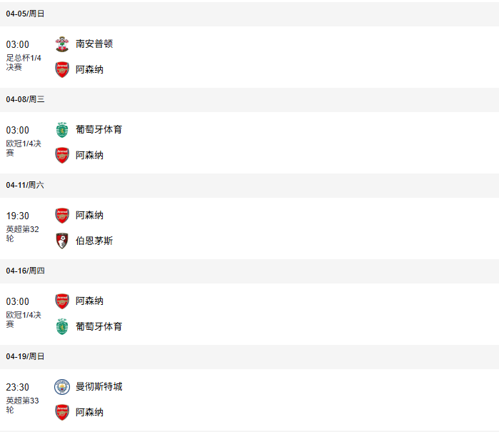 4月4日,足总杯1/4决赛,对手南安普顿;4月7日,欧冠1/4决赛,对阵葡萄牙体育;4月11日,英超打伯恩茅斯;4月15日,欧冠第二回合;4月19日,英超对曼城。