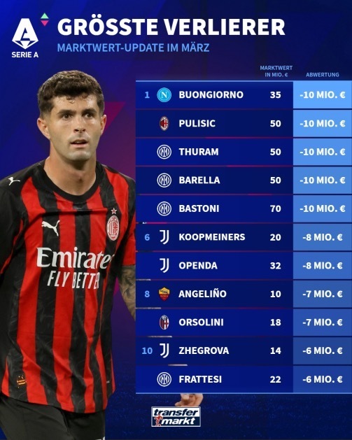 那不勒斯的布翁乔尔诺、AC米兰的普利西奇、国际米兰的图拉姆、巴雷拉和巴斯托尼均下跌1000万欧排名并列第一。
