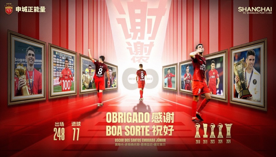 奥斯卡8年来一共为海港出场248次,打入77球,并送出141次助攻,帮助球队赢得三次中超冠军(2018、2023、2024),一次超级杯冠军(2019)。