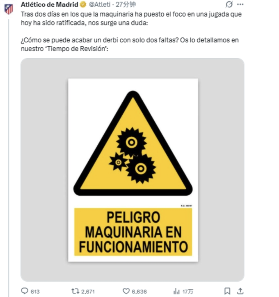 马竞官方怒批西甲存在黑幕:“一场德比大战,皇马怎么可能在90分钟里只有2次犯规。我们对此感到很是疑惑。我们希望这台‘机器(指西甲官方及裁判)’能看看这些动作并给我们答疑解惑。”
