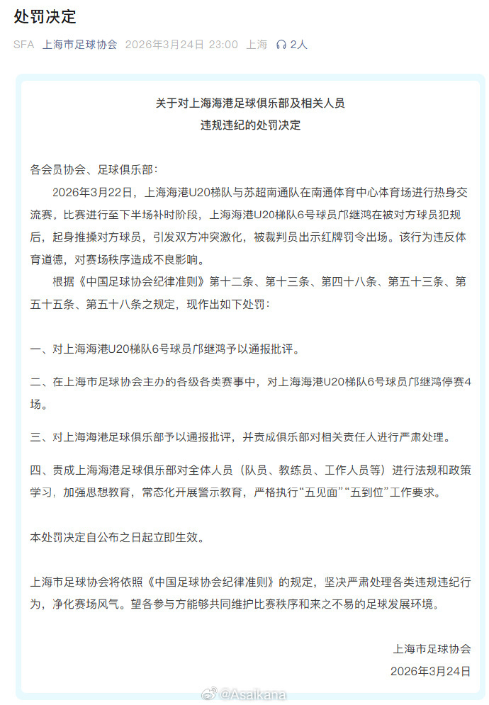 上海足协对上海海港 U21 队的处罚格式、标准乃至相关措辞,几乎完全相同:6 号邝继鸿被通报批评、上海市内赛事停赛 4 场;上海足协对上海海港俱乐部进行通报批评;责成俱乐部严肃处理相关责任人,全队开展法规政策学习、加强思想教育。