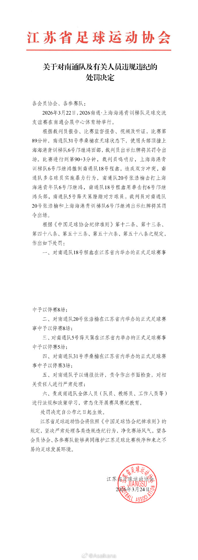 江苏足协发布《关于对南通队及有关人员违规违纪的处罚决定》提及:2026 年 3 月 22 日,2026 南通・上海海港青训梯队足球交流友谊赛在南通会展中心体育场举行。根据裁判员报告、比赛监督报告、视频及听证情况,比赛第 89 分钟,南通队 31 号季桑楠在无球状态下,使用头部顶撞上海海港青训梯队 6 号邝继鸿面部,裁判员出示红牌将其罚令出场。