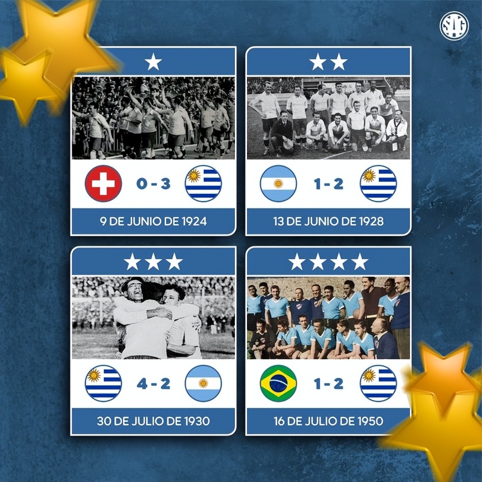 正因为这两次胜利被FIFA历史性认定为“世界冠军性质”,乌拉圭的四颗星分别代表: