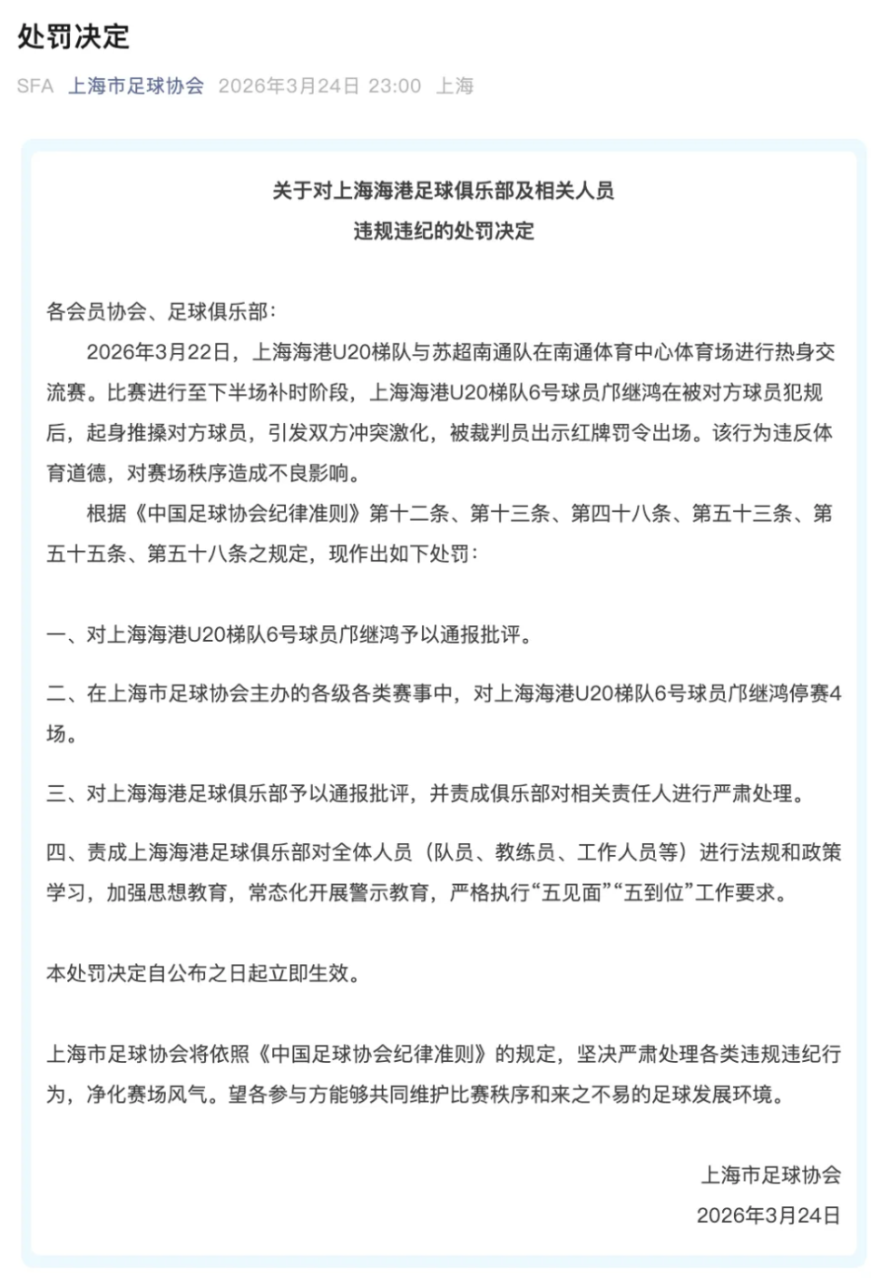 稍后,上海足协同样发布公告,2026年3月22日,上海海港U20梯队与苏超南通队在南通体育中心体育场进行热身交流赛。比赛进行至下半场补时阶段,上海海港U20梯队6号球员邝继鸿在被对方球员犯规后,起身推搡对方球员,引发双方冲突激化,被裁判员出示红牌罚令出场。该行为违反体育道德,对赛场秩序造成不良影响。在上海市足球协会主办的各级各类赛事中,对上海海港U20梯队6号球员邝继鸿停赛4场。对上海海港足球俱乐部予以通报批评,并责成俱乐部对相关责任人进行严肃处理。责成上海海港足球俱乐部对全体人员(队员、教练员、工作人员等)进行法规和政策学习,加强思想教育,常态化开展警示教育,严格执行“五见面”“五到位”工作要求。