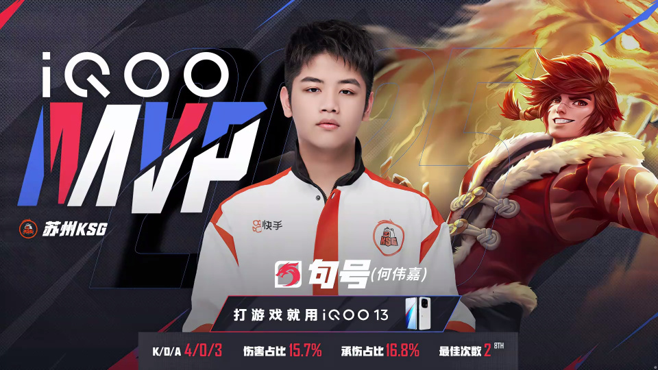 第三局,4分钟,KSG多人压下,裴擒虎击杀百里守约拿到一血,KSG点破下一塔并反掉红buff,回头收下暴君,前期节奏大开。12分钟,带着暗影暴君buff的KSG强行点掉上路高地,随后以退为进,先是安琪拉爆发伤害瞬杀夏侯惇,随后苏反扑追击,公孙离换伞输出,斩获三连决胜,KSG一波团灭对手,拿下比赛胜利!