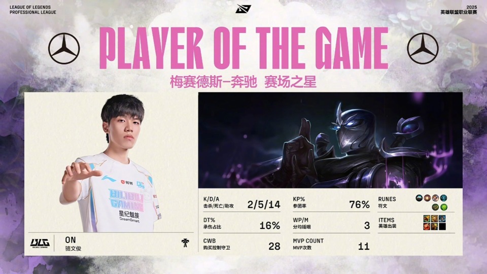 中期theshy贾克斯下路单杀knight永恩,随后IG上中到中路包夹击杀BLG三人,Gala霞豪取3杀。20分钟IG主动打厄塔汗,Gala霞疯狂输出,IG击杀北川猪妹后,拿下厄塔汗。27分钟meiiko女坦被开,Bin格温绕后包夹,BLG打出0换4后拿下第一条大龙。后期34分钟BLG拿下第二条大龙,jiejie猴子抢龙失败被秒,BLG追击打出1换4后,拿下第二局的胜利。MVP给到了ON慎。