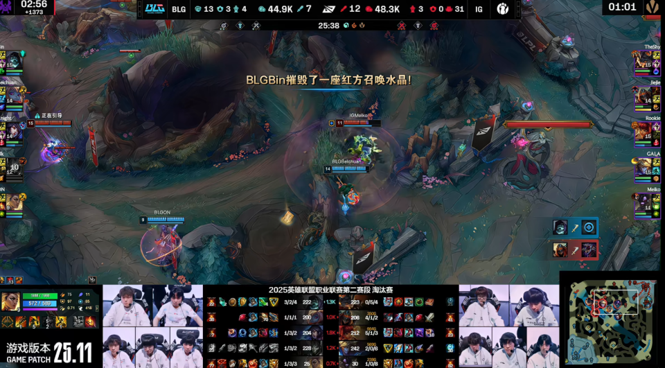 中期,TheShy的贾克斯开始发力,不仅线上压制,还成功单杀永恩展现个人实力。但关键团战中,Rookie阿萝拉空大,未能有效发起开团。BLG则借助Bin的格温与Elk的卡莎持续输出,在多次团战中收割战场,逐步扩大优势。