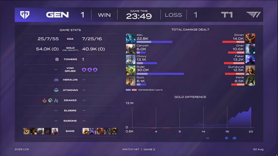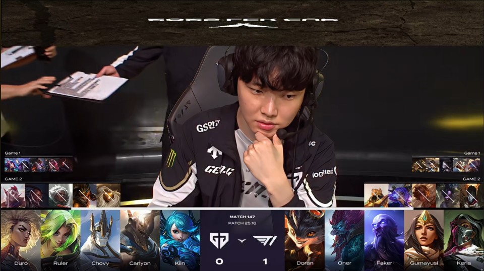 第一局比赛,T1蓝色方,禁用:岩雀、芸阿娜、兰博、安蓓萨、格温,选用:Doran鳄鱼、Oner赵信、Faker发条、Gumayusi飞机、Keria波比;GEN红色方,禁用:潘森、猴子、沙皇、巴德、牛头,选用:Kiin塞恩、Canyon蔚、Chovy阿萝拉、Ruler卡莎、Duro妮蔻
