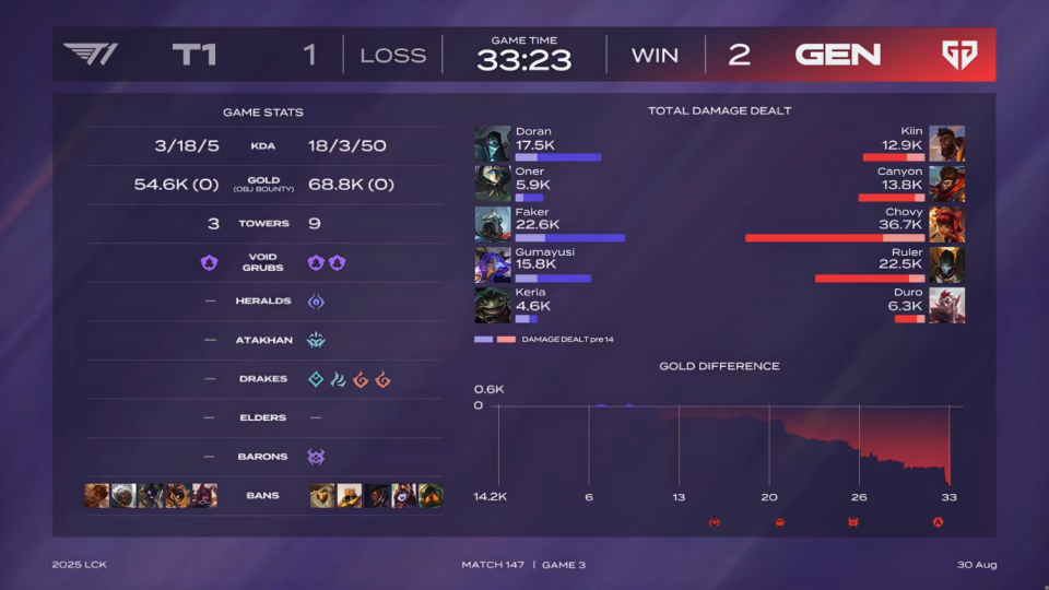 结果第三局比赛,T1没有回复状态,又是被GEN打成了碾压局。前期两队打得比较胶着,经济一直无法拉开;比赛第20分钟左右,两队爆发厄塔汗团,GEN一波打出0换3后确立优势;比赛第25分钟左右,两队在野区遭遇,GEN先后打出0换3后拿下大龙;最终比赛第33分23秒,Chovy安妮三杀,帮助GEN瞬间打出0换4后,结束比赛。