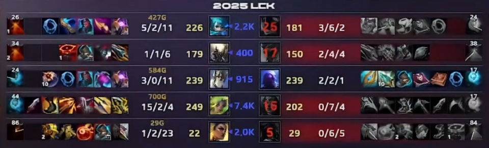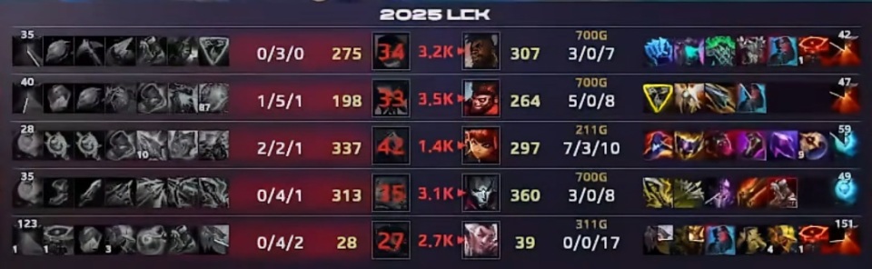 20分钟双方再次爆发团战,Ruler进场摧毁敌阵,一波直接砍下五杀,比赛早早失去了悬念,最终的比赛面板中,T1下路战绩惨不忍睹,大鸡蛋Gumayusi战绩0-7-4,辅助Keria状态也不好,战绩0-6-5。