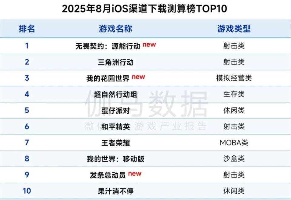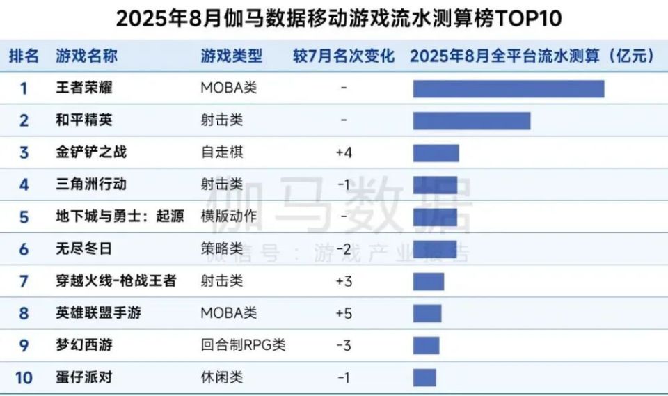 8月新游流水测算榜单共有两款射击类产品入围,在竞争激烈的射击游戏赛道,这两款新品也代表了两种不同的发展路径。由腾讯光子工作室群与拳头游戏联合开发的《无畏契约:源能行动》(《无畏契约》手游)于8月19日正式在国内开启公测,上线后展现出强大的“吸金”能力,仅十三天就以超3亿元的预估流水稳居榜首。作为端游爆款《无畏契约》的正统手游,这款产品的成功在预期之内,验证了顶级IP与成熟玩法结合的巨大市场号召力,其表现也大幅领先于同期其他新游。另一边,沐瞳推出的《发条总动员》,则试图在小众赛道走出差异化路线。该作主打飞行弹幕射击玩法,结合复古橡皮管画风,加之上线初就与《猫和老鼠》联动,进一步强化了独特的美术风格带来的优势,拿到了不错的短期爆发性成绩。目前看来,这款产品凭借玩法与美术风格的组合,展现了极强的风格化特质,有望在STG这一细分领域占据领先地位。值得一提的是在iOS下载测算榜内,射击品类占比达40%,显示出当下射击品类的强大活力。《无畏契约:源能行动》再次位列榜首,《我的花园世界》《发条总动员》两款新品也跻身榜单。回到新游流水榜单,排名第二的《我的花园世界》是一款女性向古风模拟经营手游,游戏核心玩法聚焦于“种花、插花、卖花”的轻度内容循环,并以种植经营为基础融入了家园装扮系统。然而,在看似休闲治愈的外表下,游戏搭建了一套颇为重度的商业化模型,设置了包含广告、免广告特权、多种月卡与VIP等级在内的丰富付费点。此外,“种花得真花”抽选送实体花束的营销活动,有效提升了用户的付费意愿与游戏活跃度。这款游戏用低门槛内容吸引广泛用户,再通过深度付费挖掘核心玩家的消费潜力的一套打法最终在数据反馈上也相当成功,多次登顶iOS免费榜,最高到达畅销榜13位。位列第三的《灵兽大冒险》是网易推出的一款竖屏回合制捉宠MMO。网易做MMO向来得心应手,《灵兽大冒险》也一如既往吸取了网易《梦幻西游》等经典产品的成功经验,保留传统MMO社交深度与策略复杂性的同时,利用竖屏设计完美契合了移动端的碎片化使用习惯。位列第五的《诛仙2》是完美世界今年在国内上线的首款重点新游。该作于2019年正式立项,2021年首次曝光,原计划2023年上线。然而,面对市场环境的快速变化,项目组判断产品原有定位已与玩家新需求出现偏差。为确保品质与市场匹配,项目组决定投入额外两年时间对游戏进行深度优化与改造。《诛仙2》的开局表现可谓稳健,至于它能否在未来延续完美世界在国风仙侠MMORPG赛道的传统优势,仍有待市场的长期观察与检验。点点双强跻身海外增长榜前五,《Kingshot》环比增逾20%在2025年8月的海外游戏流水增长榜中,点点互动依旧表现抢眼。其中,《Kingshot》当月流水环比增长超过20%,登顶榜首。与此同时,点点的旗舰产品《寒霜启示录》也仍然在“不知疲倦”地增长着,跻身TOP5。值得注意的是,《Kingshot》的国内版本《奔奔王国》目前已上线微信小游戏与APP端,暂处于前期测试与素材调试阶段,未大规模投入买量投放,该产品的市场潜力远未完全释放,其未来数据表现值得持续密切关注。柠檬微趣旗下旗舰消除游戏《绯闻港口》于7月下旬启动三周年庆典,当月底推出为期31天的限定活动“Triennial Triumph”,有效拉动玩家活跃与付费意愿,推动游戏单日流水突破历史峰值。人气动画《排球少年!!》改编的手游《排球少年:新的征程》国际版《HAIKYU!! FLY HIGH》于7月末正式上线,迅速登顶美国、加拿大、法国、德国、泰国等多国App Store游戏免费榜。受强势上线表现带动,该游戏在8月实现流水环比翻倍增长。2025年8月,伽马数据移动游戏流水测算榜TOP10产品整体排名波动较小,变动幅度均未超过5个位次。在本月榜单中,《英雄联盟手游》与《金铲铲之战》成为排名上升最为显著的产品。《英雄联盟手游》凭借“水晶玫瑰”系列新皮肤的推出,连续四日进入中国iOS游戏畅销榜前三,推动当月流水环比增长约40%。《金铲铲之战》则于月初上线“天下无双格斗大会”新赛季,推出“香水宝石”主题角色与皮肤,并在月中启动四周年庆典活动,多重内容更新有效拉动了用户活跃与付费意愿,助力流水持续增长。最后,纵观8月游戏市场,伽马数据报告显示,中国国内游戏市场收入为292.63亿元,环比增长0.61%,同比去年8月下降13.01%。市场增长乏力的核心原因在于缺乏现象级新作的驱动,去年同期在《黑神话:悟空》推动下形成的高基数,放大了本期的同比落差。当前市场处于“新老产品换挡”的过渡阶段,增长动能有所减弱。客户端游戏市场收入为65.63亿元,环比下降1.11%,同比增长17.59%;移动游戏市场收入达215.41亿元,环比增长0.85%,同比下降4.25%。中国自主研发游戏海外市场实际销售收入为16.8亿美元,环比下降0.79%,同比下降10.66%。由于上月大量头部产品集中推出运营活动,带来高基数效应,本月收入出现回落。