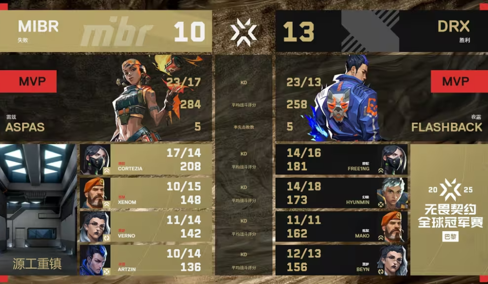 在2025年《无畏契约》VCT巴黎冠军赛移至雅高竞技场前的最后一场比赛中,DRX以2-1击败MIBR,在败者组完成艰难的晋级。尽管aspas再次打出华丽的数据,但仅靠一个人的力量,不足以在世界赛舞台拯救队伍。地图禁用过程充满惊喜,双方都必须在不擅长的地图中完成突破。MIBR在他们的选图日落之城上以13-10获胜,DRX在亚海悬城上以15-13取胜,并在源工重镇上以13-9获胜。