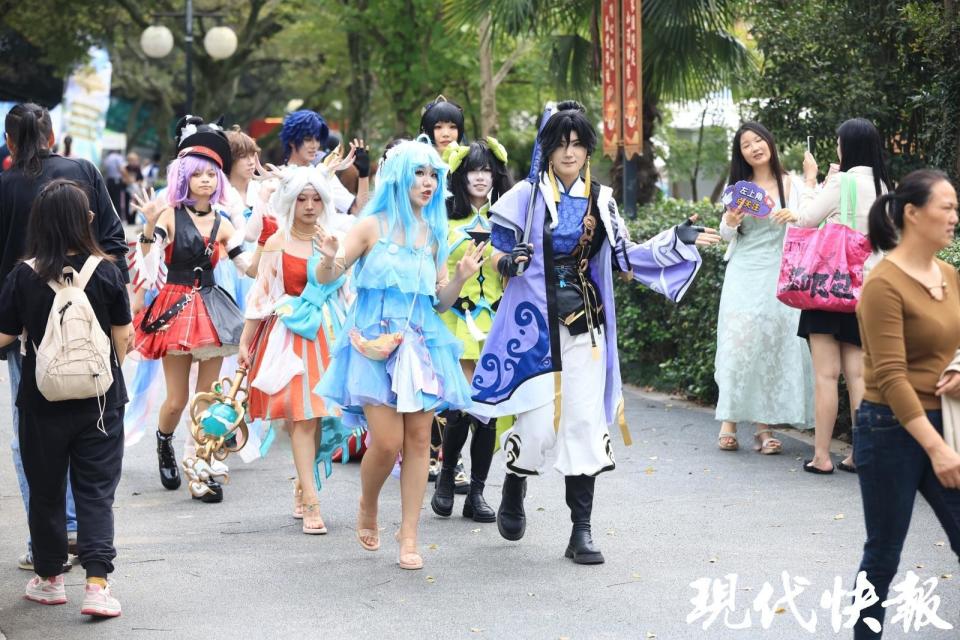 电竞主题巡游吸引众多游客目光。身着孙权、上官婉儿、孙尚香、瑶等王者荣耀英雄服饰的coser沿园区路线行进,每到一处打卡点便停下与游客互动,还为游客送上精美小礼品。此外,大乔、庄周、裴擒虎三位coser在固定的点位前,吸引游客排队打卡。