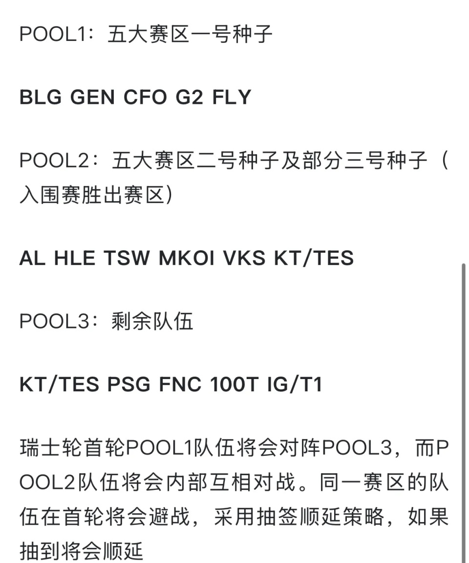 随着世界赛的逐渐临近,官方也是正式发布了这一次的分组规则,本次抽签一共分为三个池子,第一个池子是五大赛区的1号种子,分别是blg战队,gen战队,CFO战队,g2战队和fly战队。第二个池子是五大赛区的2号种子以及部分3号种子,分别是al战队,hle战队,tsw战队,mkoi战队,vks战队,Kt战队或者TES战队。3号池子是剩余队伍,KT战队或TES战队,Psg战队,fnc战队,100t战队,IG战队或者T1。首轮比赛将会是1号池子和3号池子对阵,2号池子的队伍在内部对战,同时,首轮还有同赛区规避原则。
