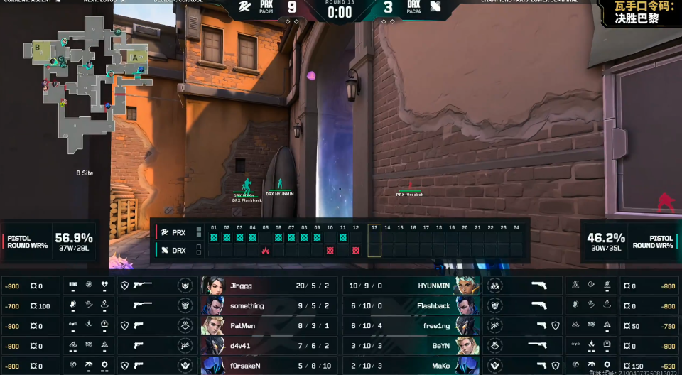 上半场PRX连拿四分,DRX第5回合暂停回来,Flashback夜露开大拿到B包点信息,DRX提速进点直接rush拿下。第6回合Jinggg贤者绕后连打三个带队赢下。PRX再度打出四连胜,上半场PRX拿到9分,DRX只拿到3分。
