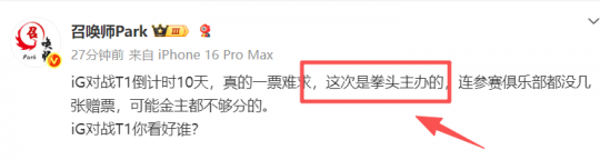 首先,根据博主“召唤师Park”的透露,因为这次世界赛是由拳头主办的关系,LPL联盟与国内俱乐部手里也没有赠票存量,想去现场观赛有且仅有“抢票”一个渠道,所以目前连俱乐部金主都不一定有这个门票。