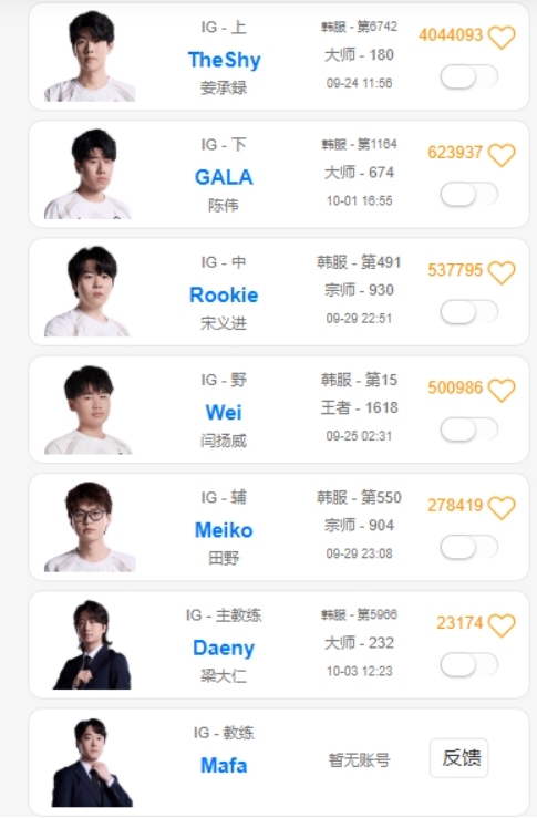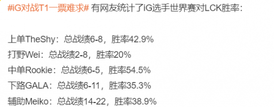 更加搞事的是,有热心网友统计了IG各成员在世界赛对LCK战队的胜率,结果意外发现仅Rookie一人胜率超过了50%,其他成员的胜率均不足50%,Wei的胜率更是只有可怜的20%,属实也是有点惨了。