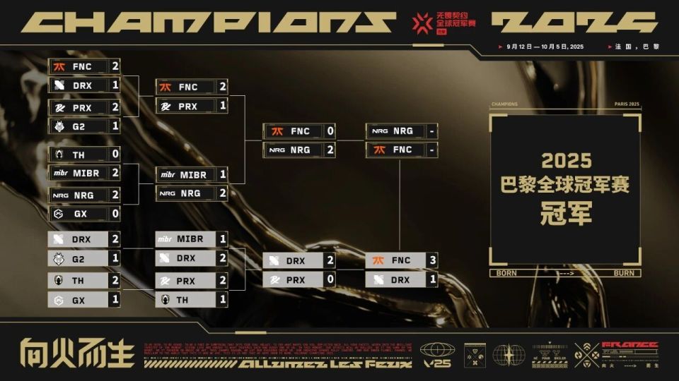无畏契约巴黎全球冠军赛淘汰赛败者组决赛已经结束!恭喜FNC战胜DRX成功与NRG会师总决赛!