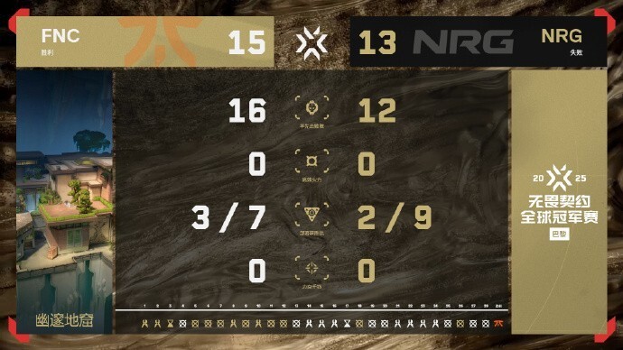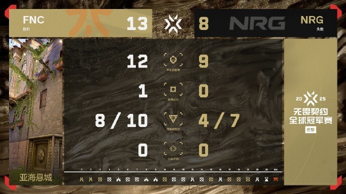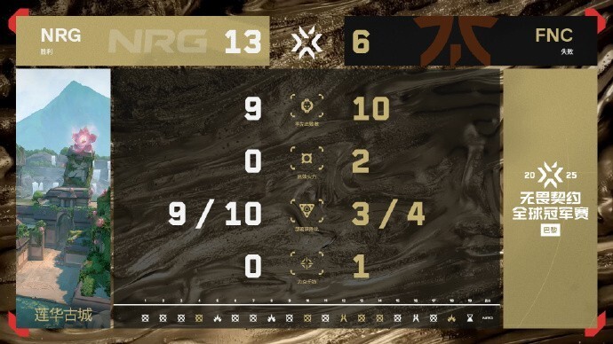 NRG手握地图BP优势,禁用2张图的同时选择盐海矿镇作为图一,在本届冠军赛全胜的他们马上进入状态,全面压制FNC,1-0先发制人;来到FNC选图莲华古城,NRG在进攻方延续手感,多点开花,一度8-1领先并将优势保持到最后,2-0把FNC逼入绝境。