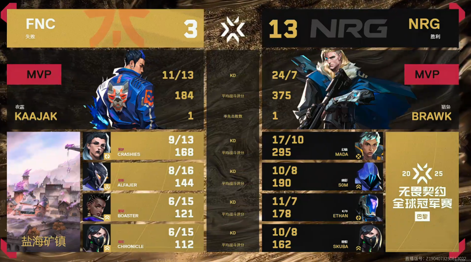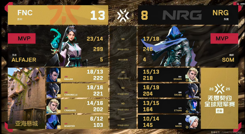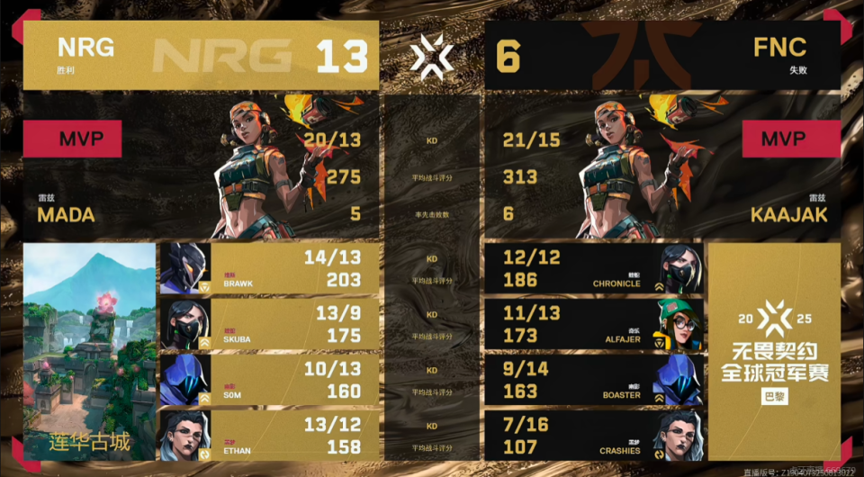 无畏契约2025全球冠军赛已经到了最后的收尾战,在刚刚过去的一天,FNC在败者组决赛,以让1追3击败了太平洋赛区的DRX,成功晋级最后的决赛,而决赛的最后,正是此前将他们打进败者组的NRG。