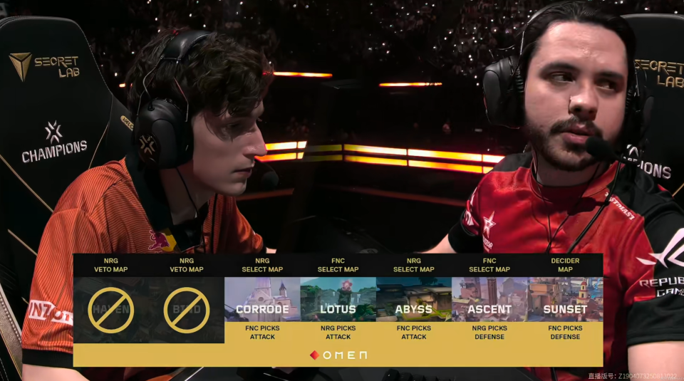 可能是第三局巨大优势被翻盘带来的影响,到了第四局,NRG的发挥显然已经出现了波动,上半场被FNC打成8-4,下半场虽然稍微找回了一些状态,但因为FNC的上半场优势,也让mada打得有些着急,最终FNC也是13-8扳平比赛,双方进入决胜地图日落之城。