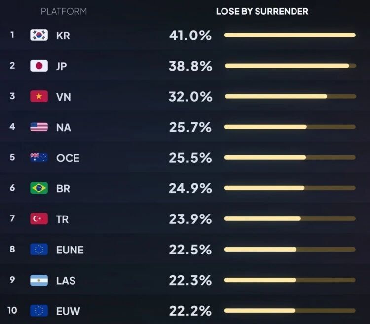 国外数据网站统计,英雄联盟各大服务器玩家投降数据: