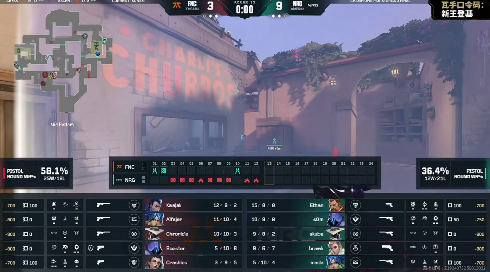 上半场FNC赢下手枪分,第3回合mada抓到FNC背身的timing,并与brawk两人守住了FNC的进攻。第4回合brawk奥丁守中,Ethan在B包点连打四个,将FNC的长枪分打掉。第8回合s0m混烟出打掉alfajer,FNC继续往A摸进但没有搜点,skuba连打三个打出完美团灭。第19回合FNC打B下包,残局二打一FNC人数优势,但skuba不断的骗拆成打掉一个强拆赢下。第11回合FNC终于打B赢下第3分。上半场NRG打出8连胜统治上半场,而FNC用出两个暂停只拿到1分,上半场NRG 9-3 FNC。